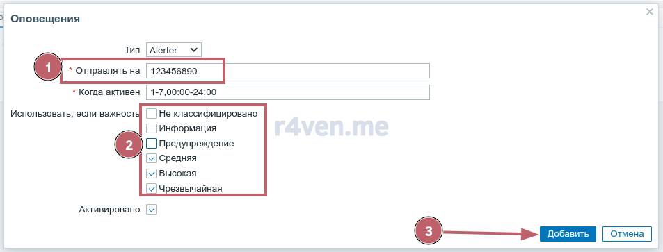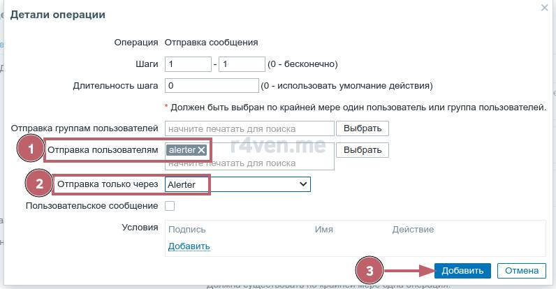 Указываем адресата — нашего сервисного пользователя, у которого прописывали ID группы/чата в телеге. Тут же указываем способ отправки: тот, что мы создали ранее: