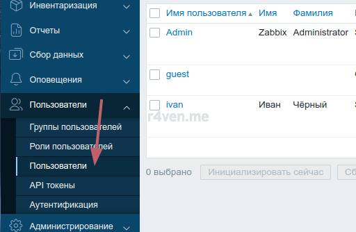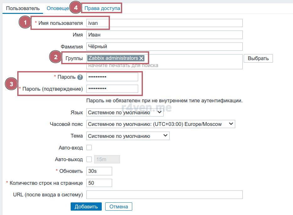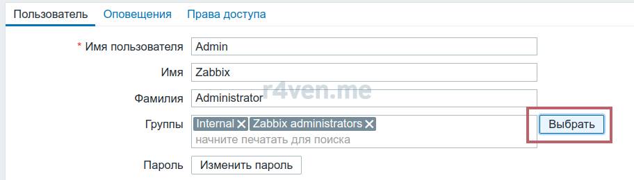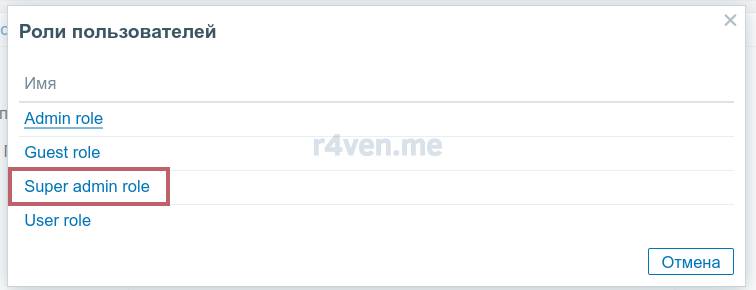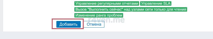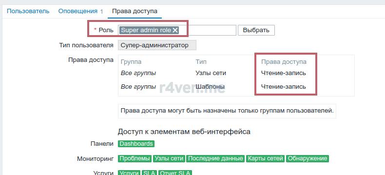 Дальше переходим в «Права доступа». Вот тут по-хорошему, необходимо сначала настроить ограниченные группы и роли пользователей. Но это тонкий процесс, и он тоже выходит за рамки статьи. Для быстрого решения я выдаю сервисному пользователю «суперадминские» права, т.к. для работы скрипта нужны права на чтение для узлов сети и шаблонов. Тут уже на ваше усмотрение.