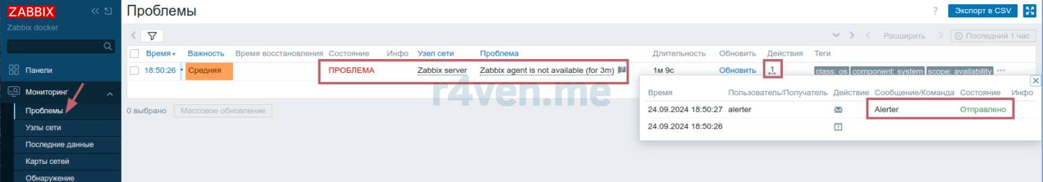 Идем в веб интерфейс по пути: «Мониторинг» — «Проблемы». Через несколько минут, агент получит статус «Недоступен», появится проблема на соответствующей веб панели и вам должно прийти уведомление в Telegram.