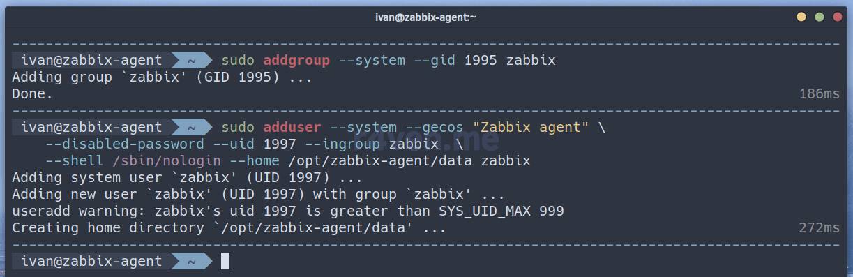 В целях безопасности создаем ограниченные в правах группу и сервисного пользователя для запуска контейнеров zabbix: