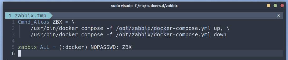Разрешаем пользователю zabbix запуск и остановку сервисов, описанных в нашем docker-compose.yml, от имени привилегированной группы docker с помощью sudo.