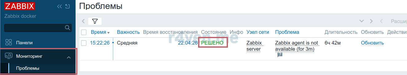 Теперь переходим на страницу «Мониторинг» — «Проблемы». Через несколько минут проблема с доступностью локального zabbix-agent должна решиться: