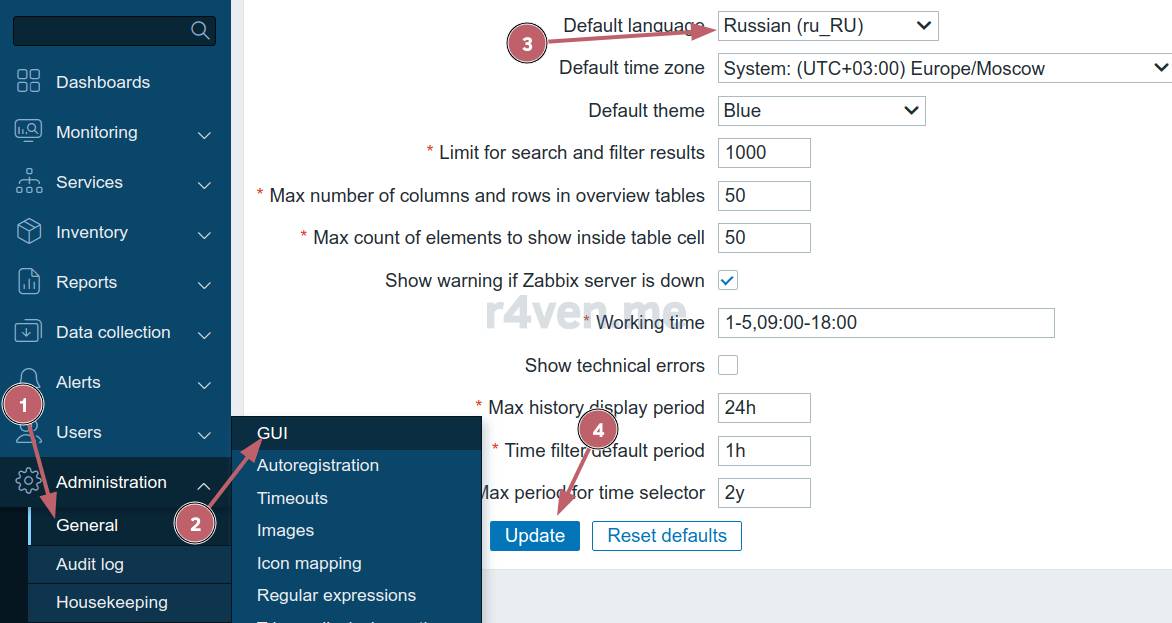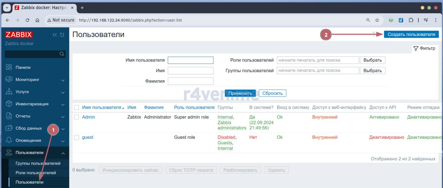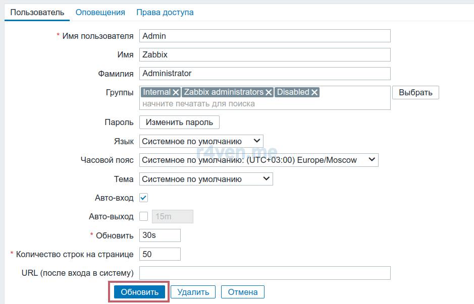 Не буду сильно вдаваться в подробности настройки Zabbix, т.к. это тема не одной статьи 🤯. Покажу лишь как поменять язык интерфейса, создать нового пользователя с админскими правами, отключить стандартного Admin и настроить локальный Zabbix agent для мониторинга самого Zabbix сервера.