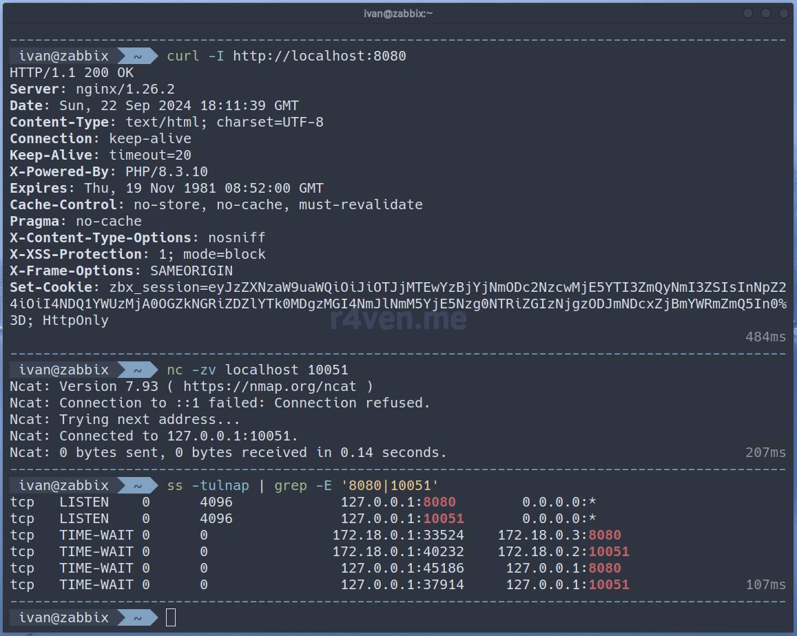 Первой командой мы проверили доступность веб интерфейса из консоли, второй — доступность порта zabbix-server, а третьей вывели порты, прослушиваемые хостовой ОС.