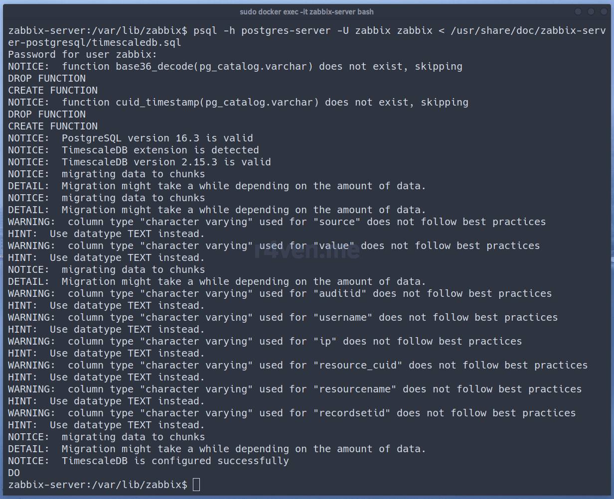 Теперь импортируем схему TimescaleDB с помощью SQL скрипта, который разработчики Zabbix любезно положили в системные файлы. При вводе команды импорта у нас запросят пароль от БД, который мы вывели на предыдущем шаге: