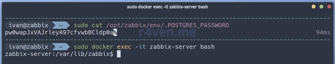 Выводим созданный ранее пароль в терминал, скоро он нам понадобится. Затем подключаемся к оболочке контейнера zabbix-server: