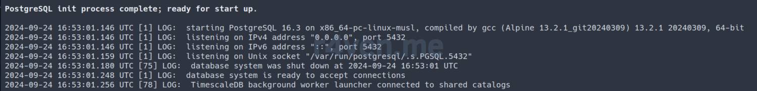 При первом запуске, котейнер запустит создание базы. Это займет некоторое время. Вывод остановится на такой строке:
