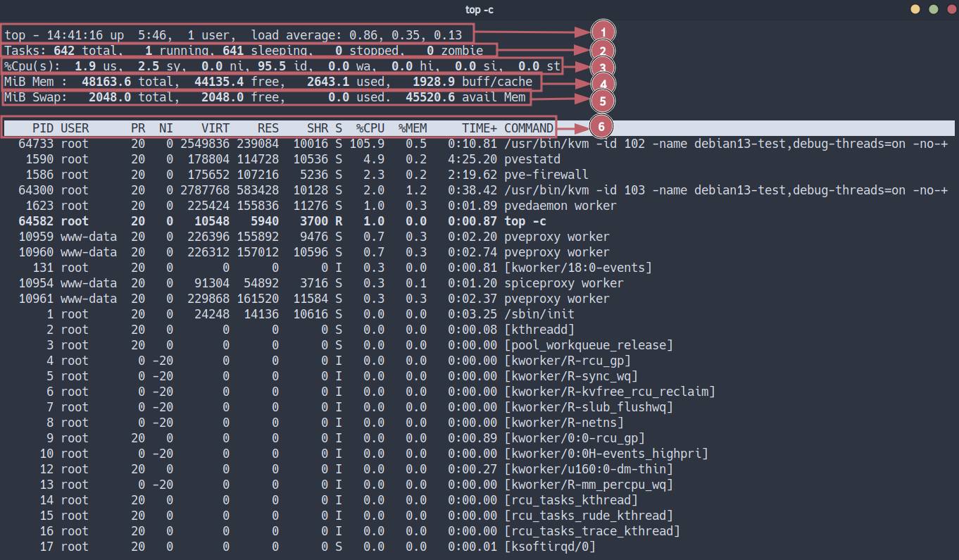 14:41:16- текущее системное время;up 5:46- время непрерывной работы ядра (uptime) с момента последней загрузки;1 user- количество активных терминальных сессий (tty/pts);load average(LA) - экспоненциально взвешенное скользящее среднее длины очереди выполнения процессов на CPU за 1, 5 и 15 минут🤯.
