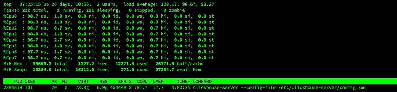 Сможете прокомментировать такой top?) Всего 1 запущенный процесс, на 8 ядрах грузит их все, но LA почти 100. При этом сервер весьма отзывчив на команды и не выглядит перегруженным.