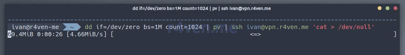dd if=/dev/zero bs=1M count=1024 | pv | ssh ivan@vpn.r4ven.me 'cat > /dev/null'