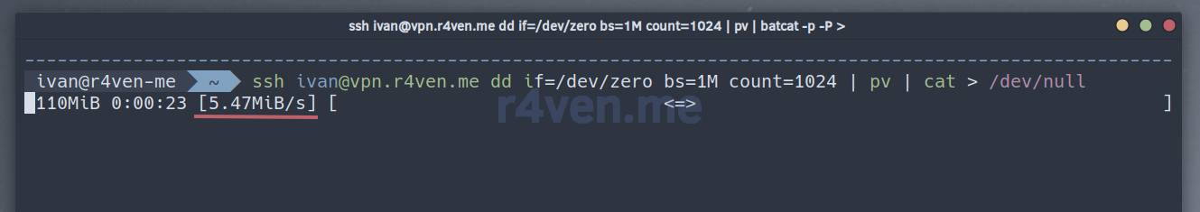 dd if=/dev/zero bs=1M count=1024— генерирует поток нулевых данных (/dev/zero) на локальной машине также с помощью утилитыdd(1 ГБ);| pv— измеряет скорость передачи данных;| ssh ivan@vpn.r4ven.me 'cat > /dev/null'— передает данные через SSH на удалённый сервер также в черную дыру.