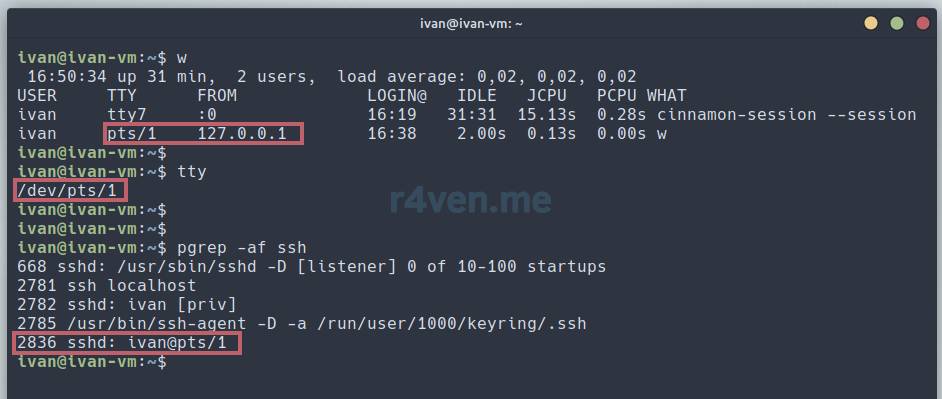 Как видим, подключившись по ssh, система выделила для нас псевдотерминал (pts) для работы в оболочке. С помощью команд выше мы проверили, что мы работаем в консоли через SSH соединение.