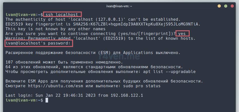 sudo apt install openssh-client openssh-serverПодключение по SSH к localhost