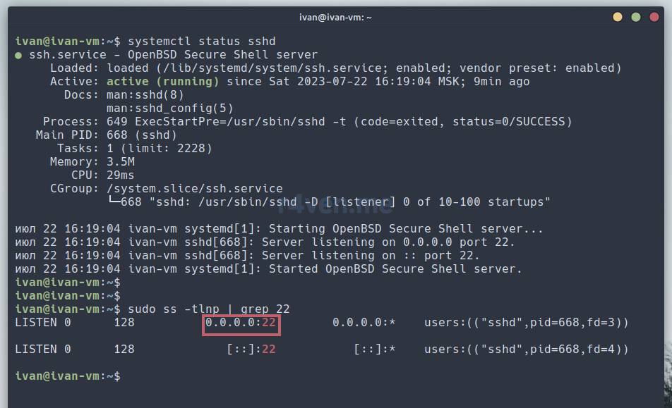Выполним проверку статуса сервиса sshd командой и проверим открытость порта 22: