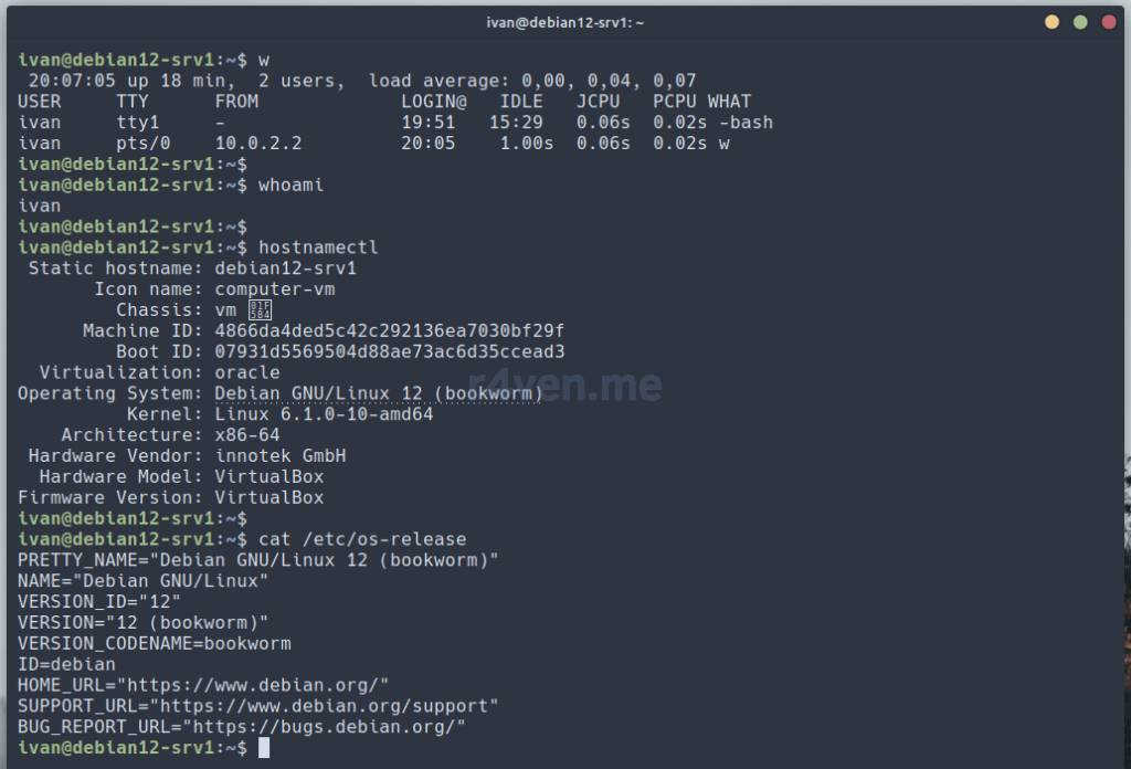 И так мы подключены по безопасному каналу к нашей виртуальной машине с Debian 12. Теперь мы можем делать с ней всё то же самое, что и с локальным компьютером с помощью командной строки Linux.