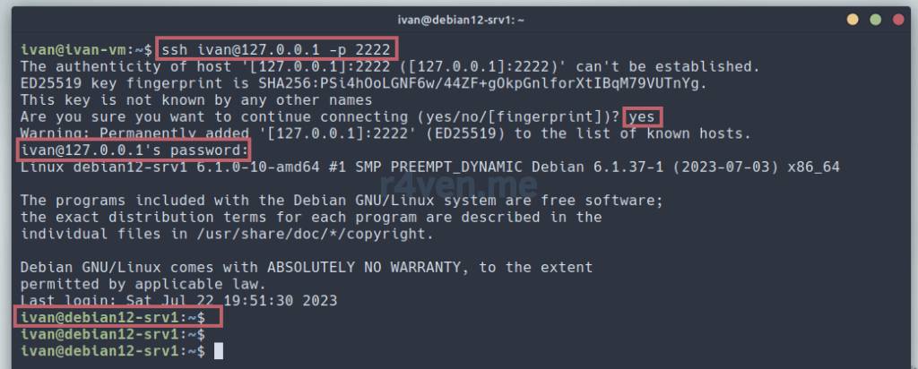 ivan— имя удаленного пользователя, под которым мы подключается к серверу;@— символ разделитель;127.0.0.1— loopback адрес нашей локальной ОС (он же localhost);-p 2222— ключ-pиспользуется для указания порта, отличного от стандартного.
