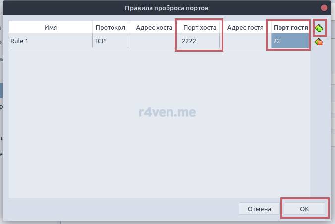 В открывшемся окне нажимаем зеленый плюс справа, появится новая строчка правила проброса. Тут указываем произвольный номер порта хоста (желательно не из стандартных), в нашем случае это 2222, и порт на гостевой ОС, это стандартный порт сервера SSH — 22: