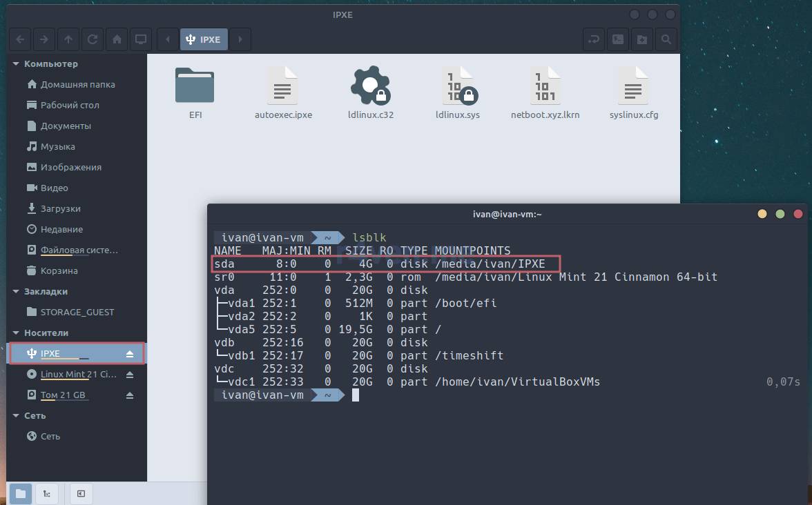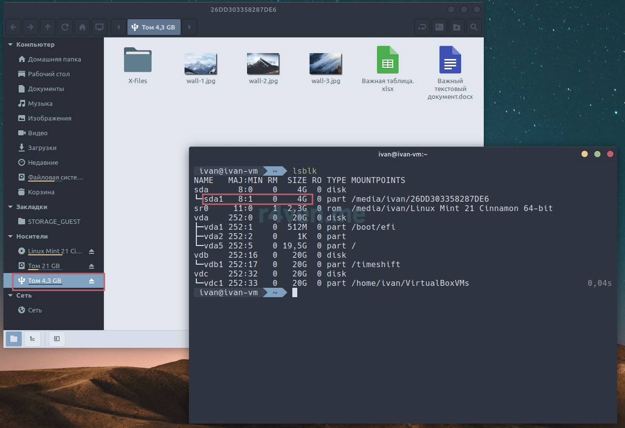 Вставляем нашу флешку в компьютер. Теперь определим её блочное имя в нашей Linux системе, с помощью файлового менеджера и терминала: