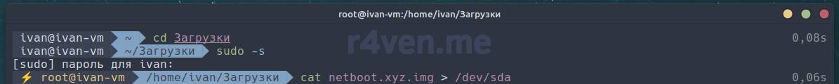 Открываем терминал в той директории, куда был скачан образ netboot.xyz.img и выполняем команду, как указано на официальном сайте (от имени суперпользователя):