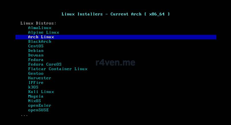 Можем также попробовать запустить инстралятор какого нибудь другого дистрибутива, например Arch Linux. В главном меню выбираем Linux Network Installs, затем нужный дистрибутив: