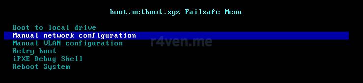 При подключении к сети вашей машины посредством DHCP, сетевые параметры получаются автоматически. Если у вас используется статика, то ее можно настроить нажав m во время начальной загрузки netboot.xyz:
