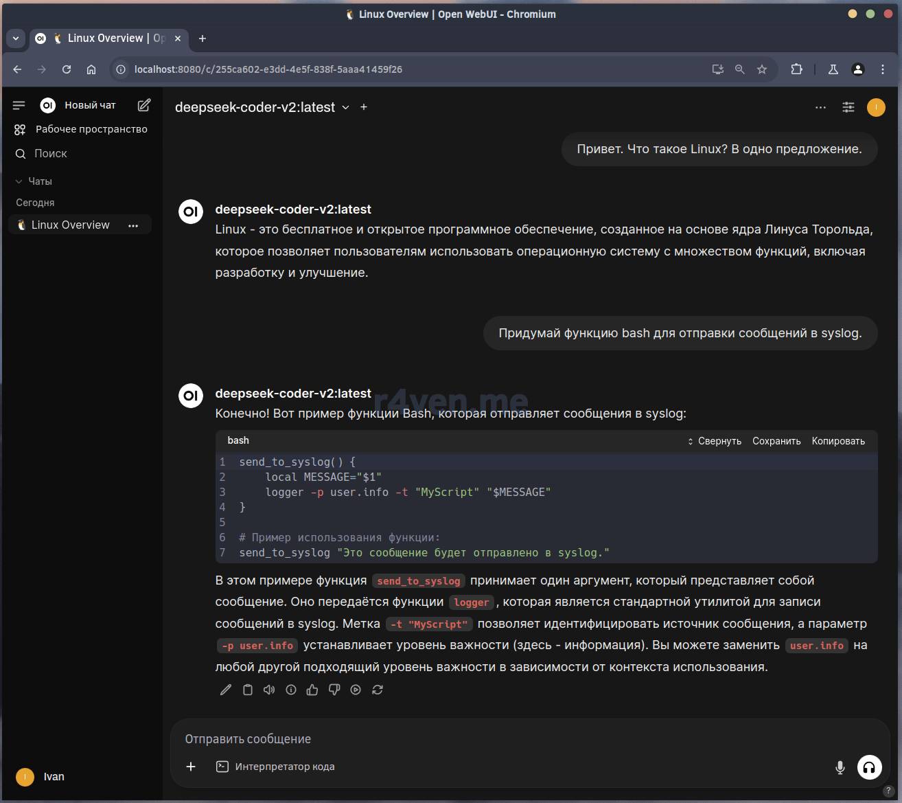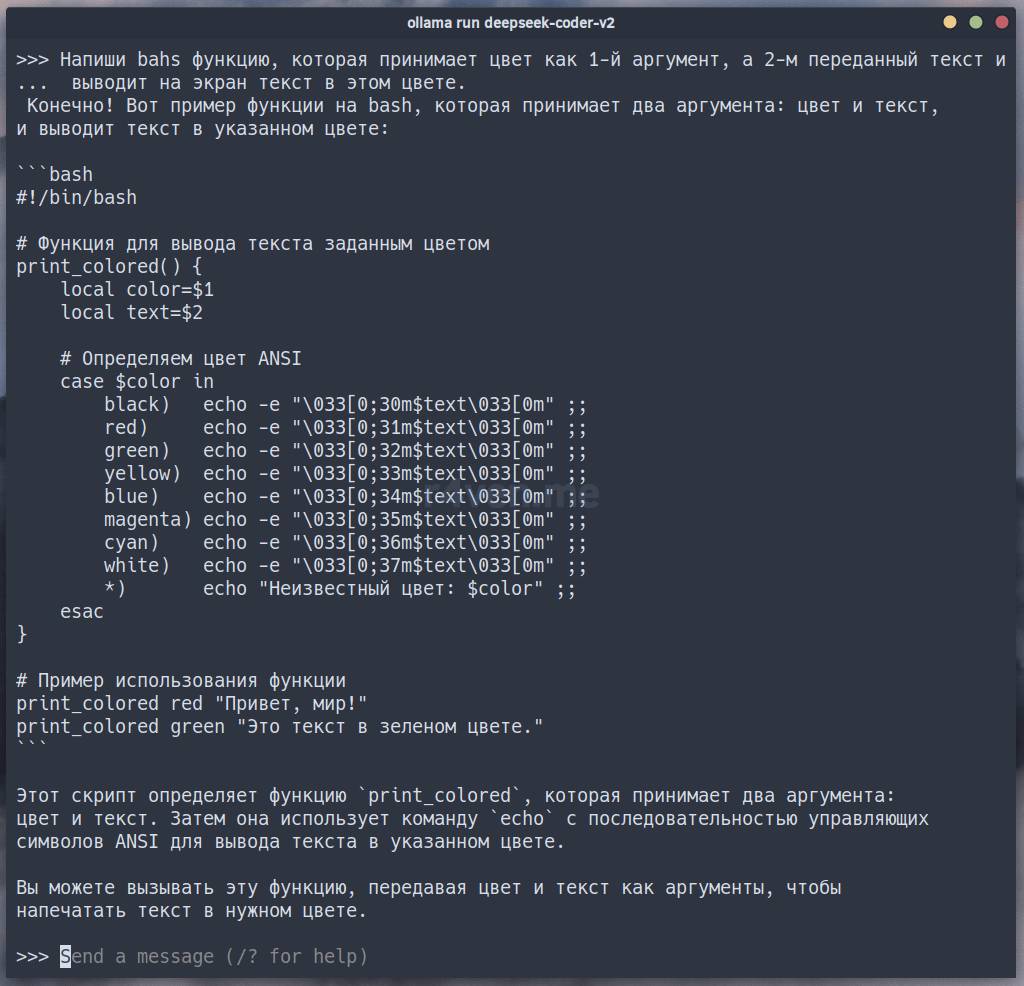 В данной статье я рассмотрю лишь пример с моделью, которая неплохо разговаривает по-русски и ориентирована на работу с различными языками программирования, в том числе и языками оболочек, таких как Shell/Bash/Zsh и др — deepseek-coder-v2. Да, одна из вариаций той самой нашумевшей китайской ИИ модели с открытым исходным кодом👌.
