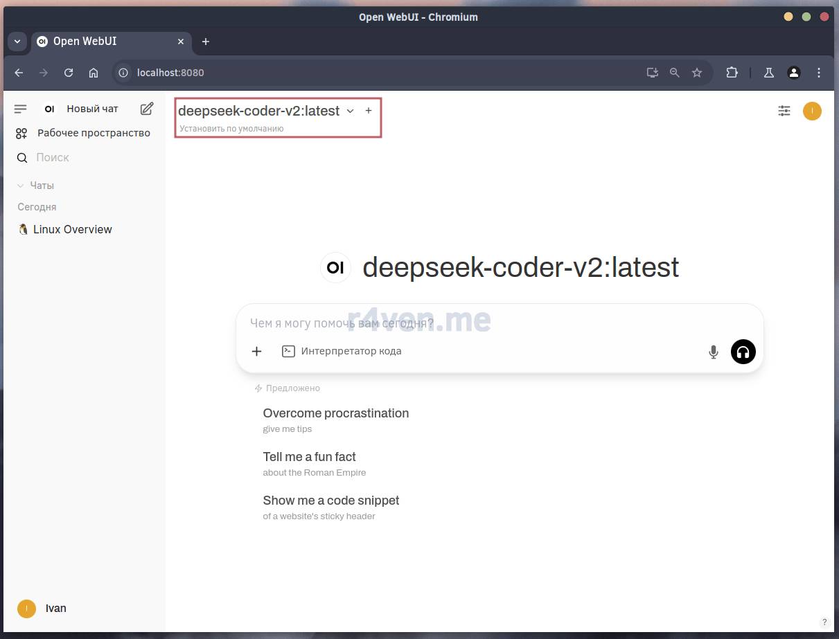 И наконец попадаем в окно чата. Как видно, UI подключился в Ollama и DeepSeek уже используется в качестве модели по умолчанию: