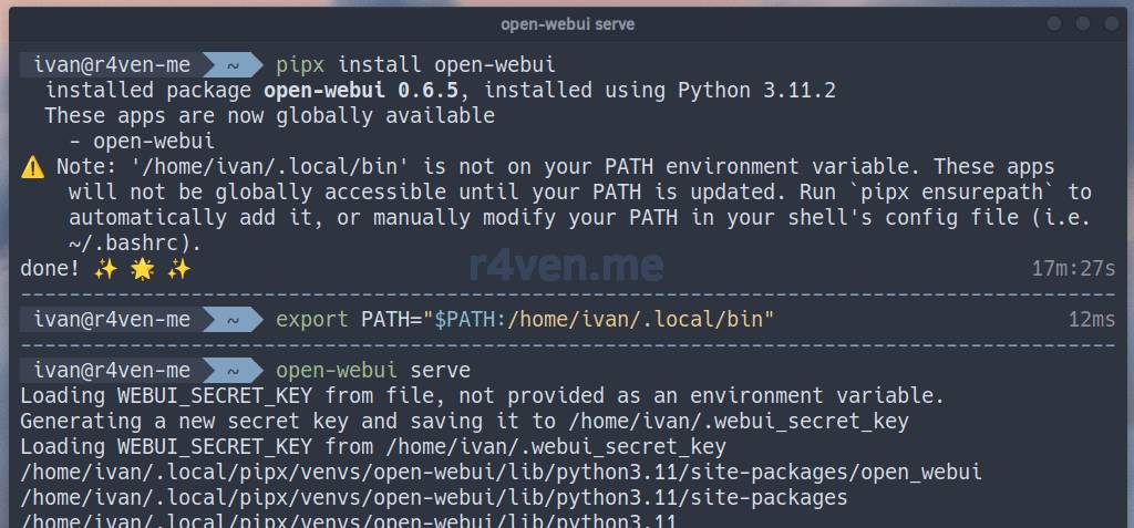 Для запуска open-webui из консоли необходимо, чтобы директория ~/.local/bin была добавлена в системную переменную $PATH. Добавляем ее по необходимости и запускаем UI: