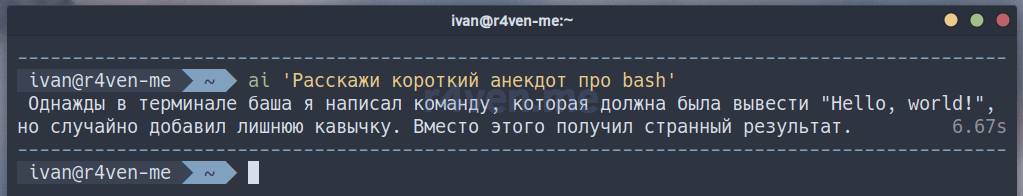}' | jq -r .responseМожно сделать удобную shell функцию для быстрого обращения из консоли: