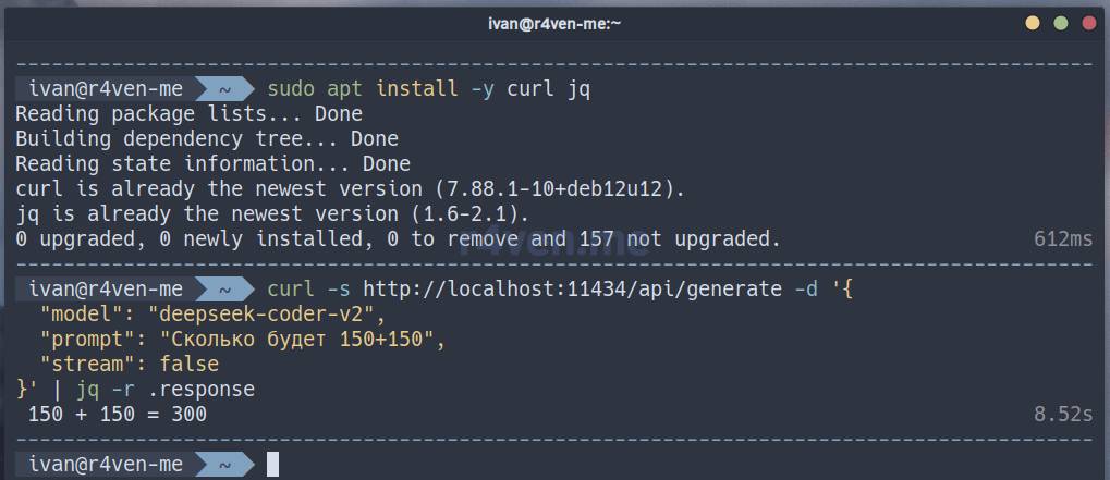 ss -tlnp | grep 11434По этому адресу можно отправлять API запросы, например, с помощью curl+jq: