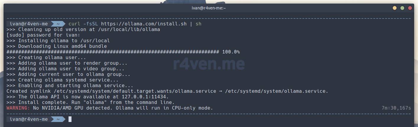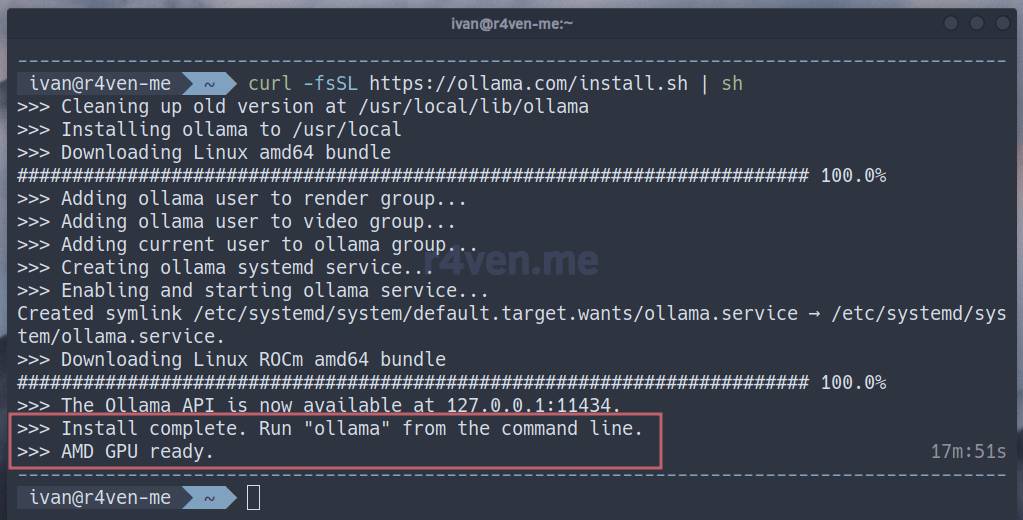 curl -fsSL https://ollama.com/install.sh | shУспешная установка Ollama для ПК с GPU от AMD