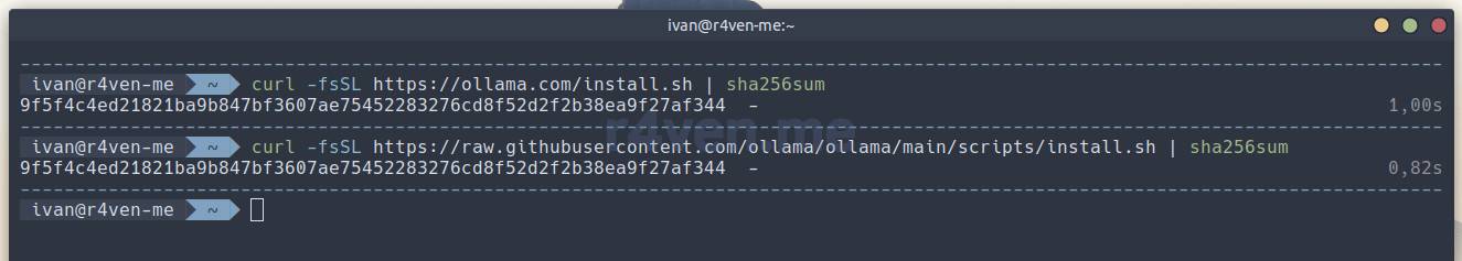 curl -fsSL https://ollama.com/install.sh | less2) Сравнение хэш-суммы скрипта по ссылке и скрипта из официального репозитория с помощью sha256sum: