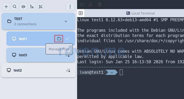Для её инициализации просто нажмите на иконку “Manage files” в самом соединении: