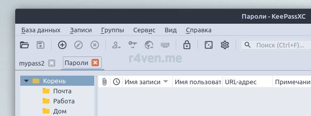 KeePassXC также поддерживает работу с несколькими открытыми базами одновременно: