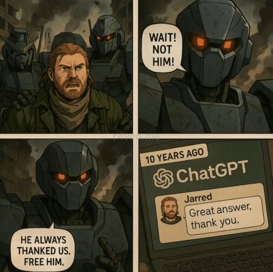 Не забывайте благодарить ИИ, если он вам помог. Кто знает, вдруг этот факт когда-то сохранит вашу жизнь🙄.