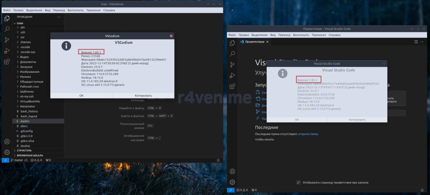 Стоит отметить оперативность сборок VSCodium разработчиками. Ниже показаны версии VSCodium и оригинального VSCode: