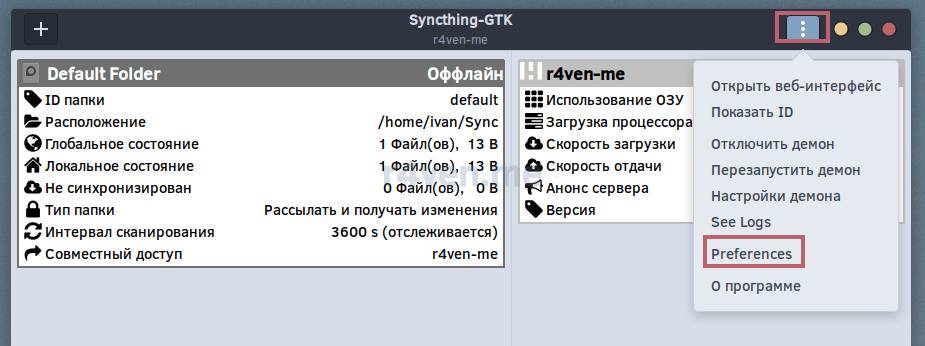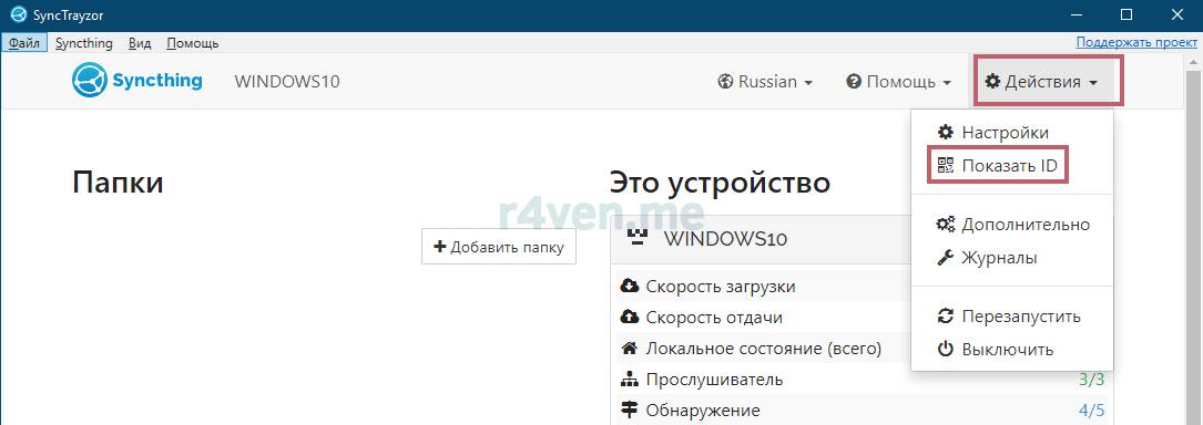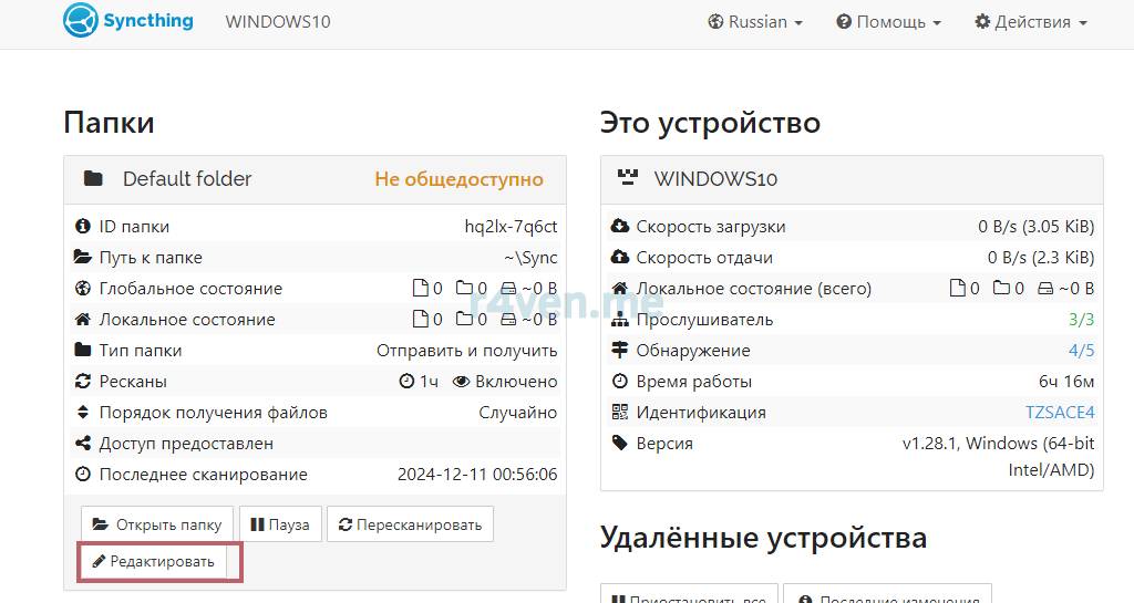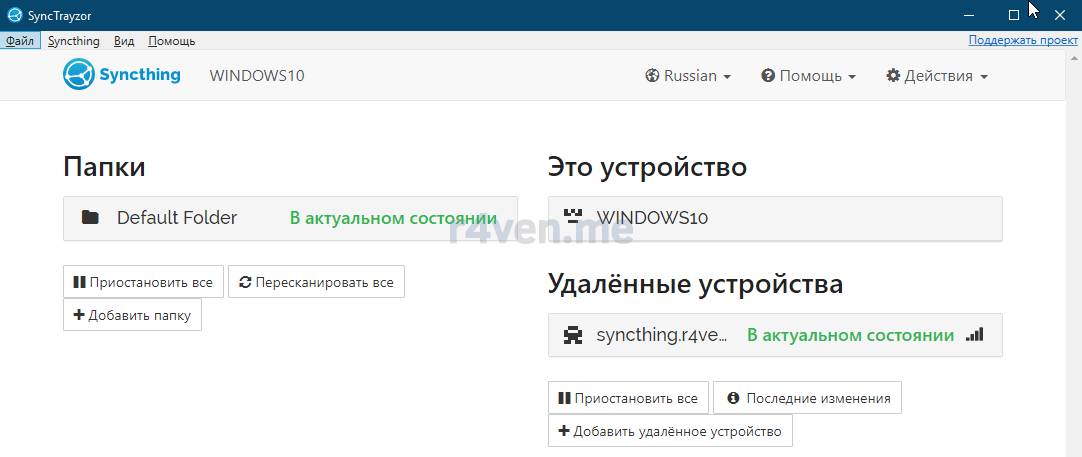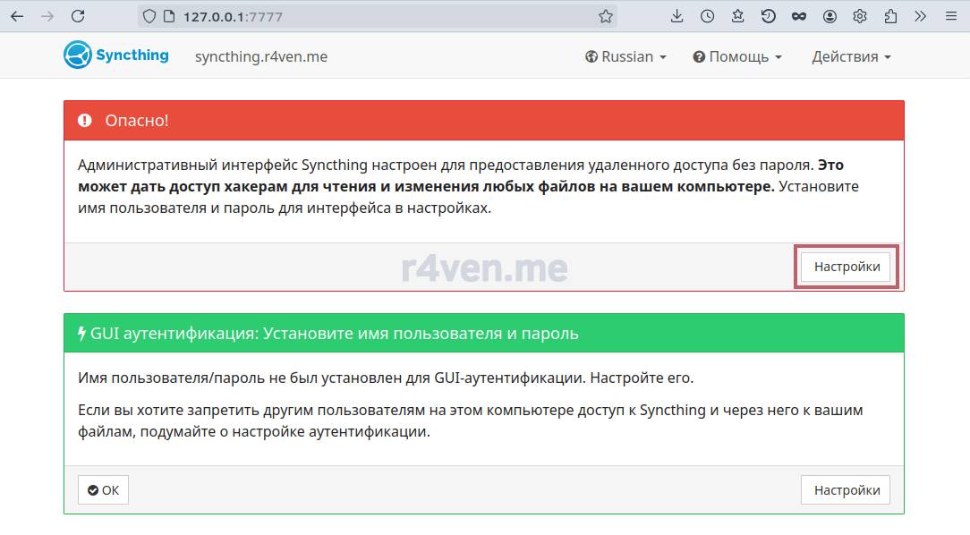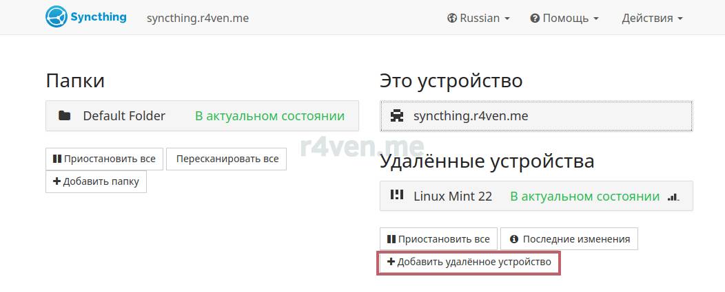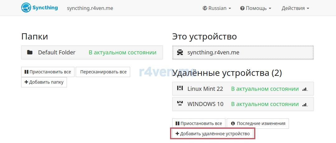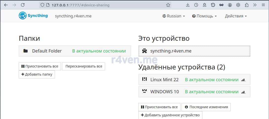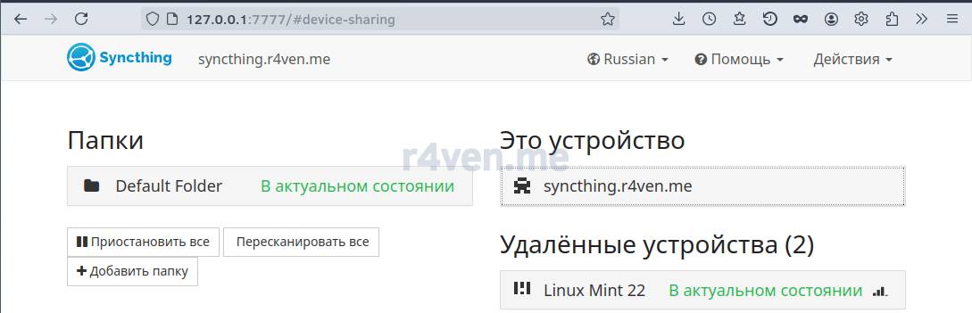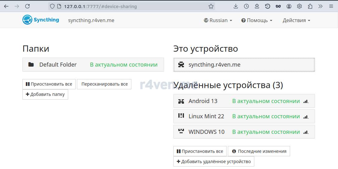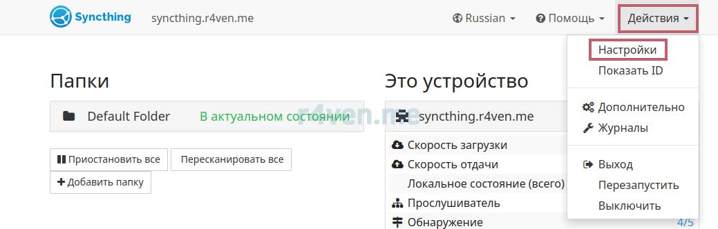 Перед нами откроется основное меню управления Syncthing🧑💻.