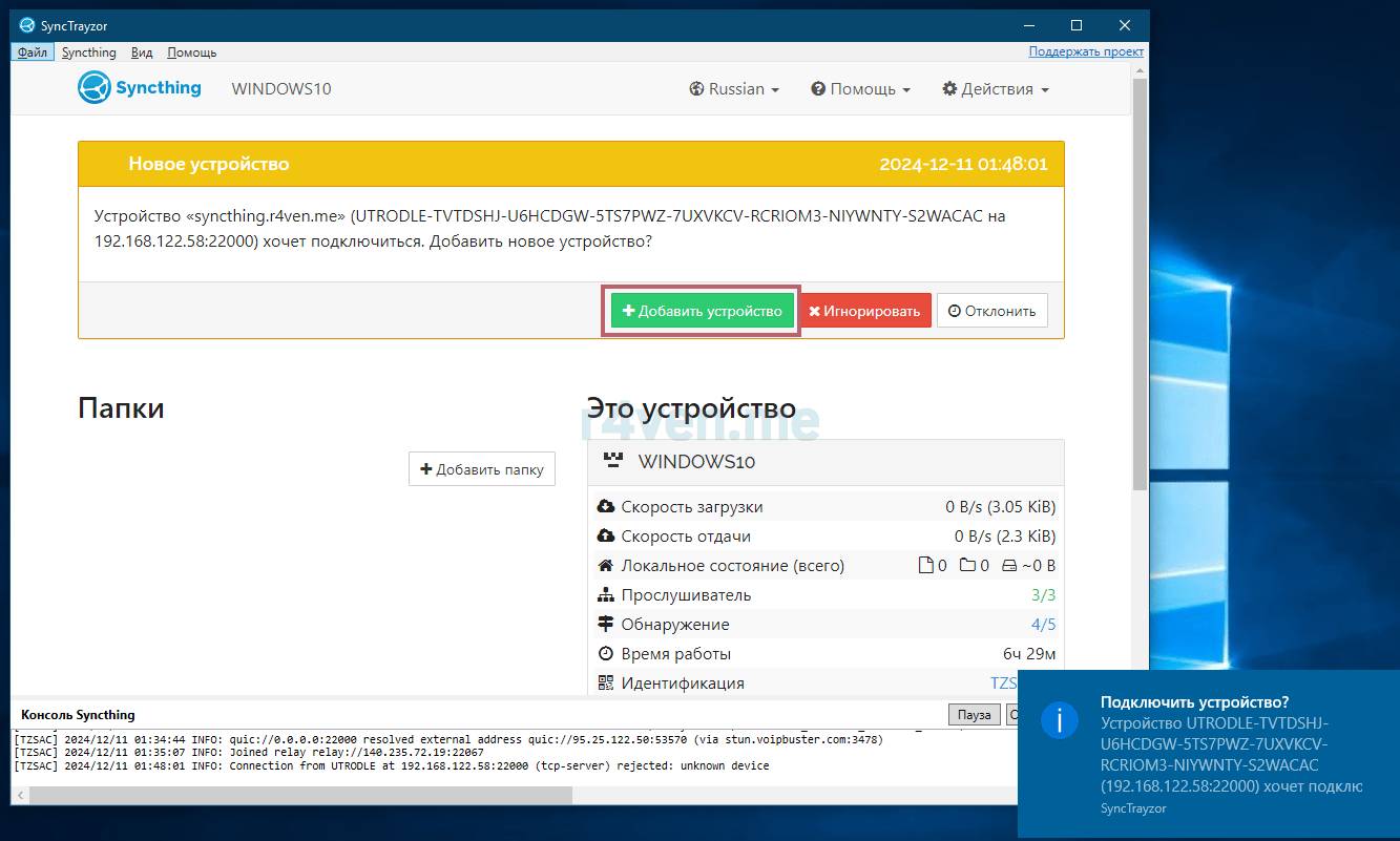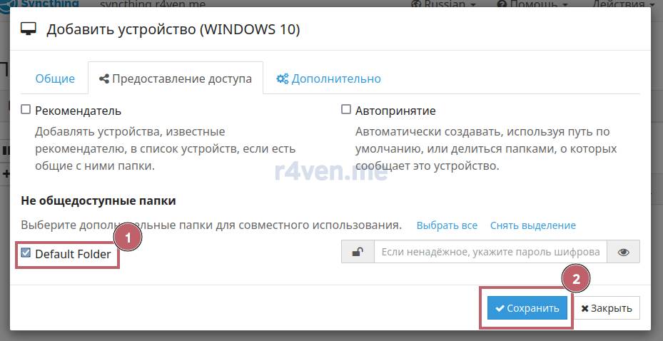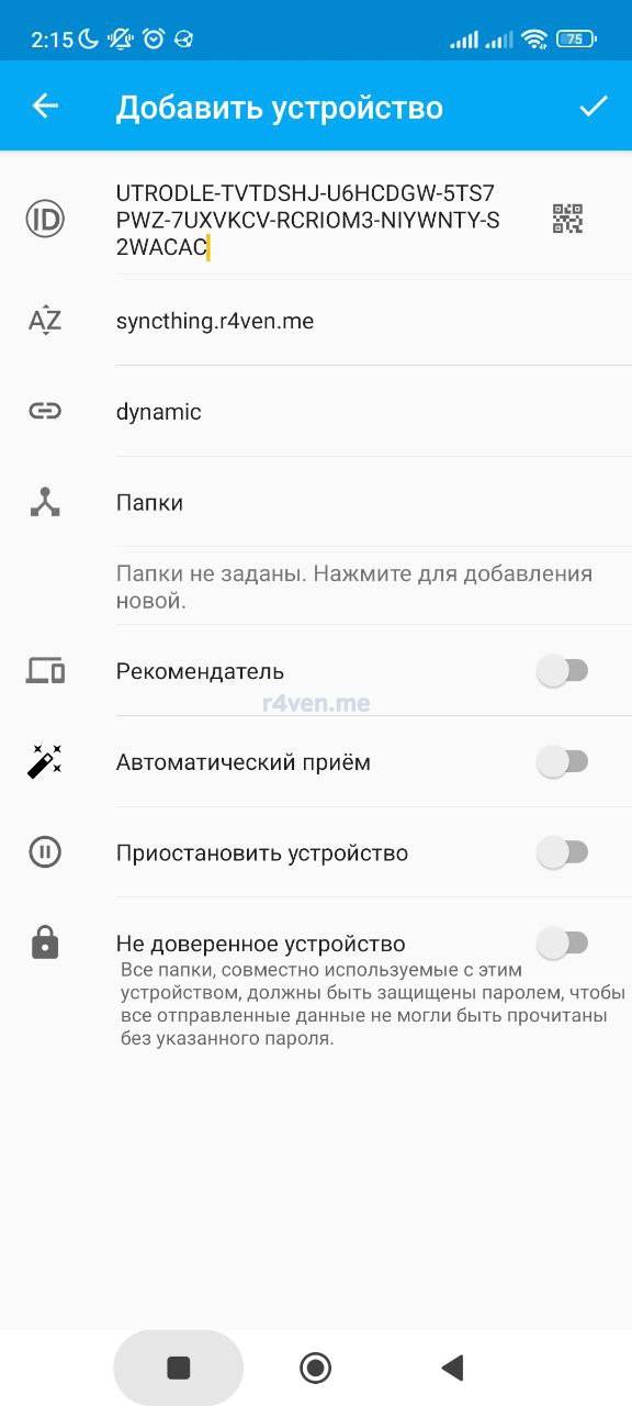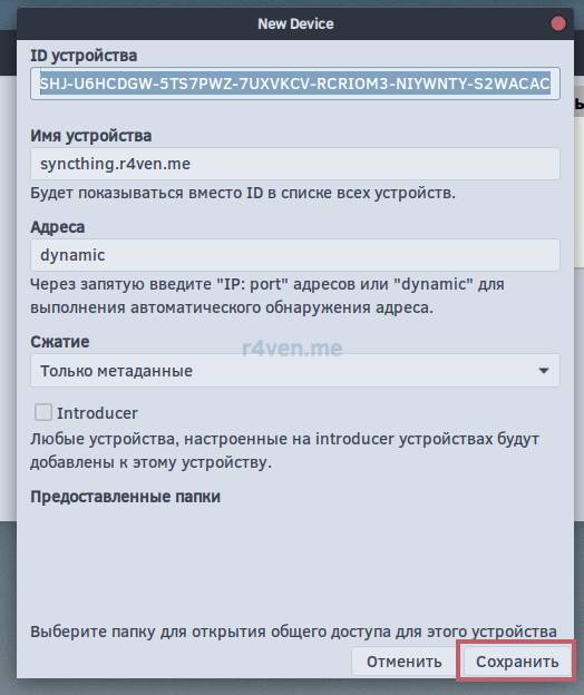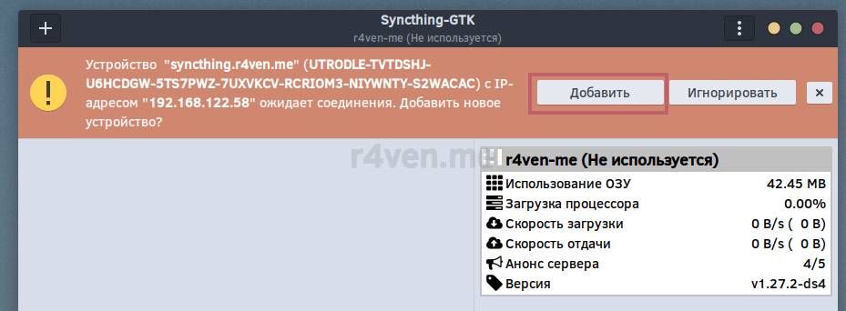 - Нажимаем «Добавить устройство», указываем там ID от Android и выбираем директорию для синхронизации;