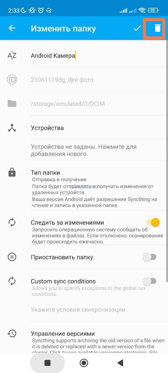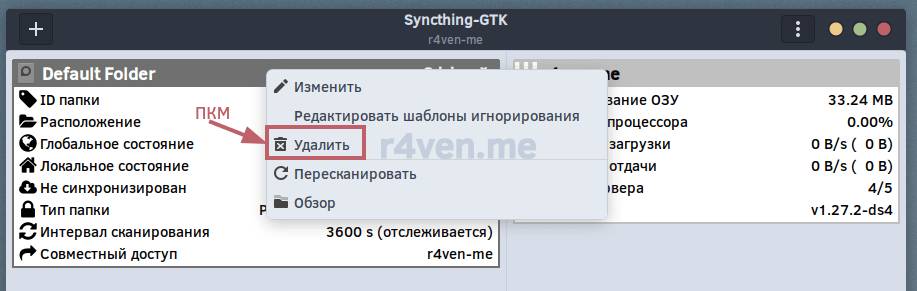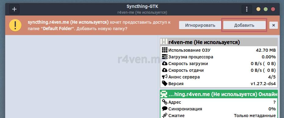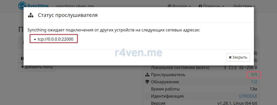 Важный момент! В основной синхронизируемой директории (на киленте и на сервере) есть скрытый служебный каталог .stfolder. Не удаляйте его иначе синхронизация выпадет в ошибку и придется все подключать заново.