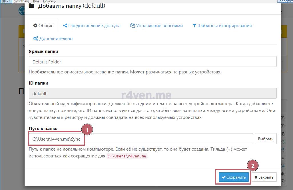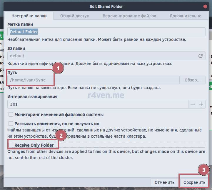 Тут указываем путь до локальной папки, которую будем синхронизировать, а также убираем чекбокс с пункта «Только получение» (Receive Only Folder):
