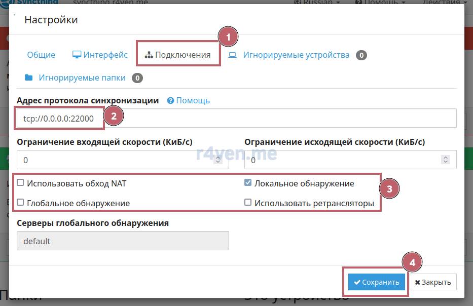 tcp://0.0.0.0:22000Также на этой вкладке отключаем лишние параметры, кроме локального обнаружения:
