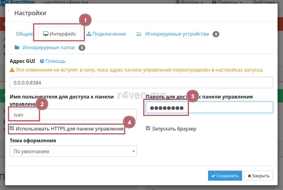 sudo systemctl restart syncthingПосле чего перейдите в настройки сервера в веб интерфейсе уже по новому адресу (у меня это http://192.168.122.233:8384: