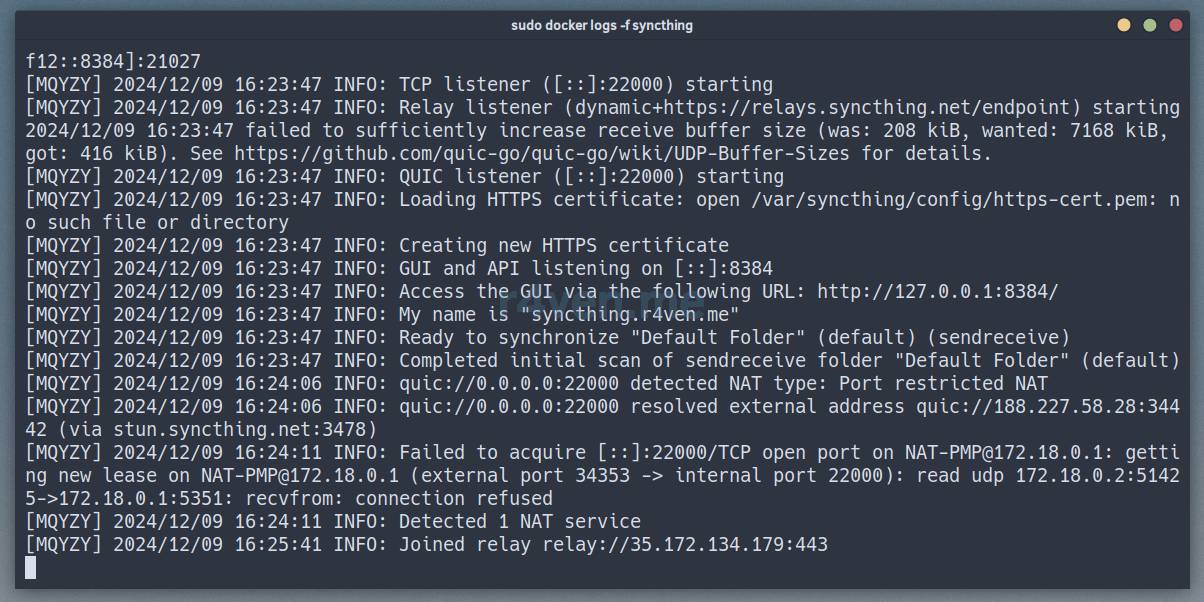 syncthing, описанный в файлеdocker-compose.ymlнамеренно ограничен в аппаратных ресурсах на использованиеcpus: '0.70'иmemory: 512M, т.е максимально разрешенное использование CPU составляет 70% одного ядра и 512 мб RAM. При необходимости скорректируйте данные параметры в соответствии со своими потребностями. Подробнее про лимиты ресурсов сервисов при использовании docker-compose читайте тут.