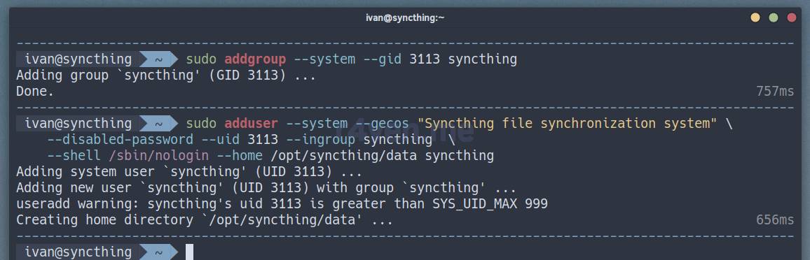 Теперь создадим сервисные группу и пользователя syncthing для запуска сервиса: