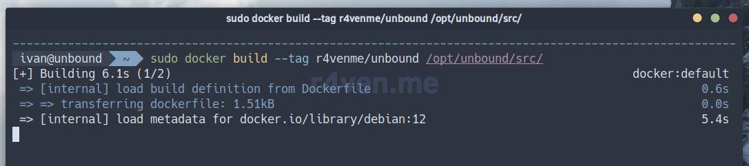 sudo docker build --tag r4venme/unbound /opt/unbound/src/Где r4venme/unbound — произвольный тег образа. В данном случае я указал имя пользователя на Docker hub и через / название репозитория.