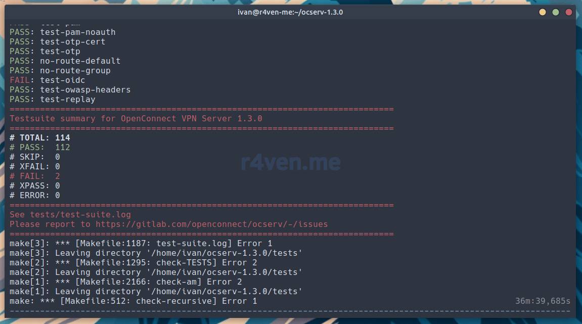 После распаковки переходим в созданную директорию с исходниками и запускаем сборку, а также проверку ocserv, и все это от имени root: