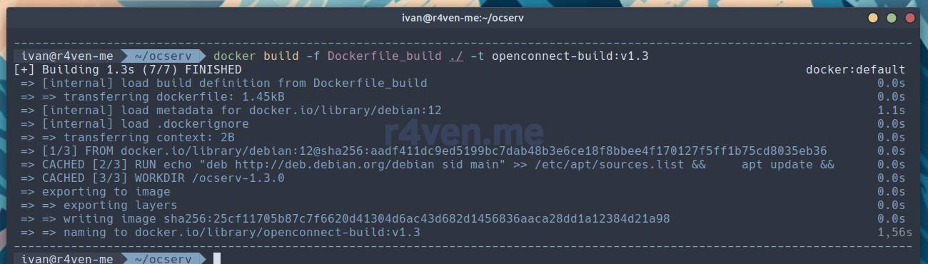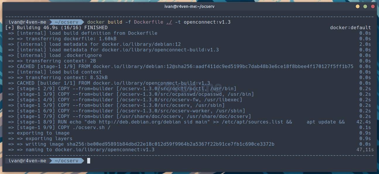 -fявно указывается файла описания сборки,./означает использовать текущую директорию как рабочую, аopenconnect-build:v1.3— это имя собираемого образа и его тег (v1.3), по которому мы будем обращаться при сборке конечного образа.