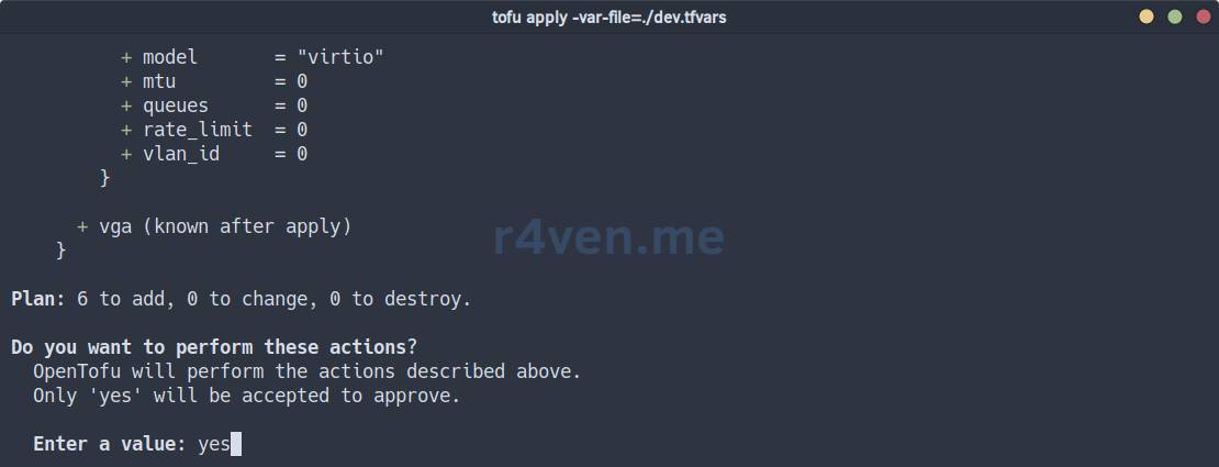 tofu plan -var-file=./dev.tfvarsЕсли все значения вы заполнили верно, то команда выполнится без ошибок и покажет вам будущие изменения/добавления в Proxmox: