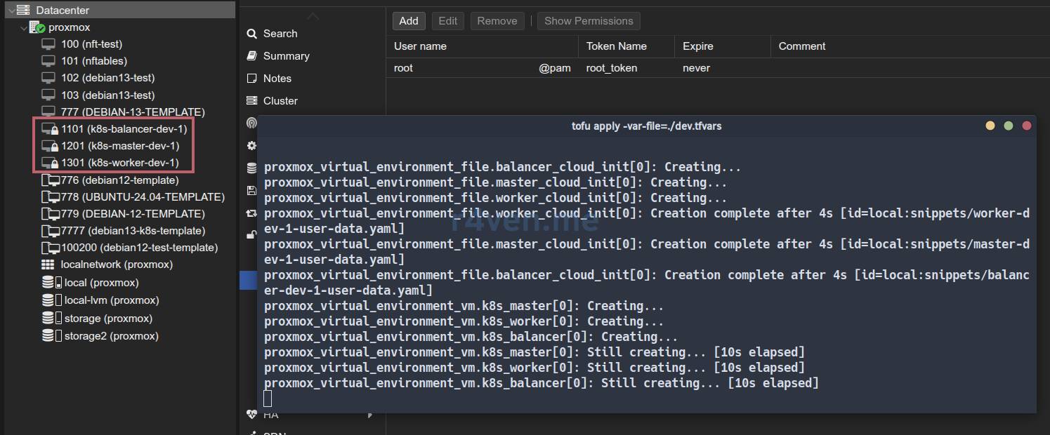 tofu apply ./prod.tfplan -parallelism=2📝 В OpenTofu / Terraform параметр parallelism определяет максимальное количество ресурсов, которые могут создаваться / изменяться / удаляться одновременно. При создании большой инфраструктуры в Proxmox рекомендуется указывать значение 1-2, чтобы избежать ошибок вида: