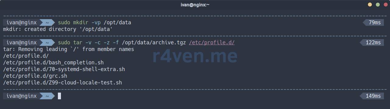 Создаём тестовую директорию и архив с данными, например с файлами в /etc/profile.d/: